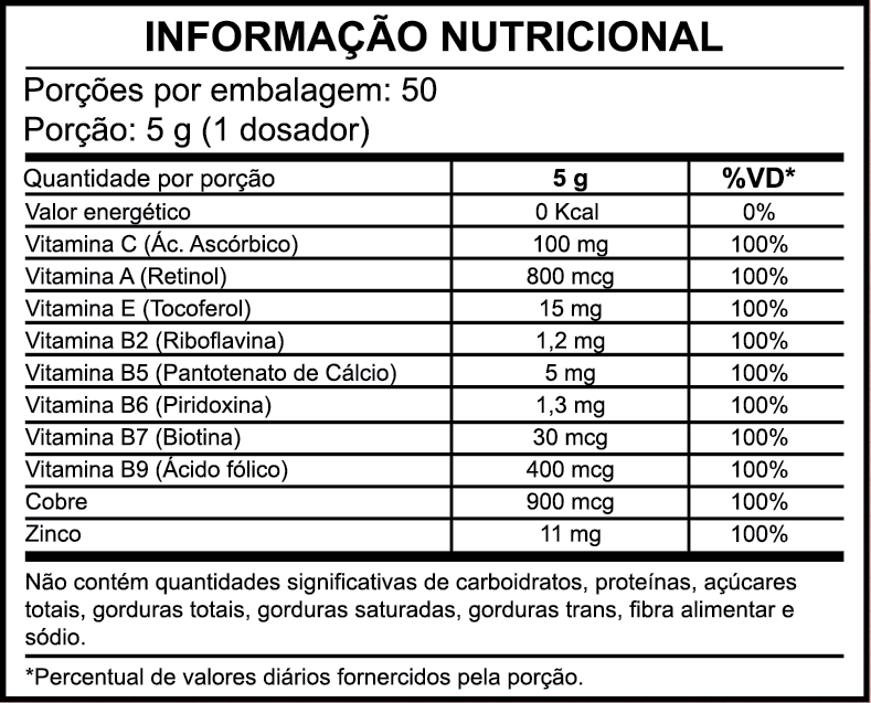 INGREDIENTES: Peptídeos de Colágeno com peso Molecular 2kDa, Colágeno Hidrolisado, Colágeno tipo II, Vitamina C, Vitamina E, Zinco Bisglicinato, Vitamina B5, Vitamina B6, Vitamina B2, Cobre Bisglicina- to, Vitamina A, Vitamina B9, Vitamina B7. Contém Aroma Artificial Frutas Vermelhas, Acidulante Ácido Cítrico, Edulcorante Sucralose. Maltodextrina q.s.p. NÃO CONTÉM GLÚTEN.
