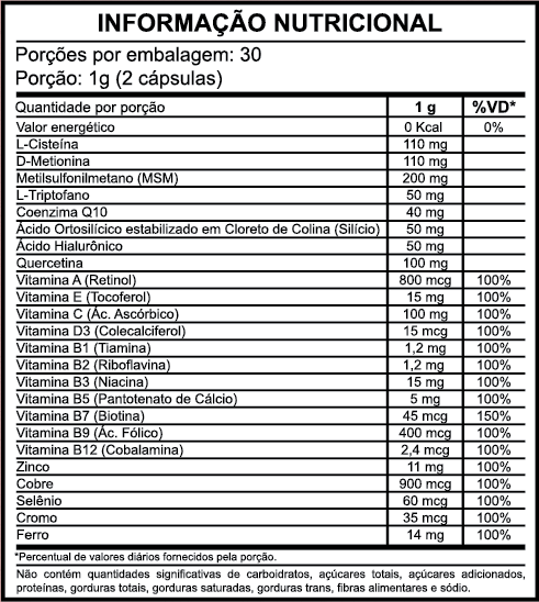 INGREDIENTES: Metilsulfonilmetano, D-Metionina, L-Cisteína, Vitamina C, Quercetina, Ferro Bisglicinato, Zinco Bisglicinato, Ácido Hialurônico, Ácido Ortosilícico estabilizado em Cloreto de Colina, L-Triptofano, Coenzima Q10, Vitamina E, Vitamina B3, Vitamina B5, Vitamina B2, Vitamina B1, Cobre Bisglicinato, Selênio Bisglicinato, Cromo Bisglicinato, Vitamina A, Vitamina B9, Vitamina B7, Vitamina D3, Vitamina B12. Contém Amido de Milho, Antiumectante (Dióxido de Silício INS 551), espessante Estearato de Magnésio (INS-470 III). Composição da Cápsula: Colágeno bovino e dióxido de titânio (Corante INS 171).