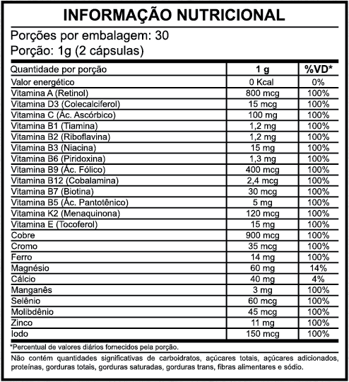INGREDIENTES: Magnésio Bisglicinato, Cálcio Bisglicinato, Vitamina C, Vitamina B3, Vitamina E, Ferro Bisglicinato, Zinco Bisglicinato, Vitamina B5, Manganês Bisglicinato, Vitamina B6, Vitamina B2, Vitamina B1, Cobre Bisglicinato, Vitamina A, Vitamina B9, lodeto de Potássio, Vitamina k2, Selenometionina, Molibdato de amônio, Cromo Picolinato, Vitamina B7, Vitamina D3, Vitamina B12. Contém Amido de Milho, Antiumectante (Dióxido de Silício INS 551), espessante Estearato de Magnésio (INS-470 III). Composição da Cápsula: Colágeno bovino e dióxido de titânio (Corante INS 171).