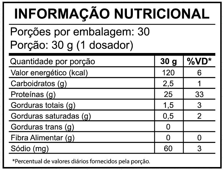 INGREDIENTES: Proteína de soro de leite concentrada, Cacau em pó alcalino, Aromatizante sintético idêntico ao natural sabor Baunilha, Leite em pó, Edulcorante Sucralose. ALÉRGICOS: CONTÉM DERIVADOS DO LEITE E DA SOJA. CONTÉM LACTOSE. NÃO CONTÉM GLÚTEN.